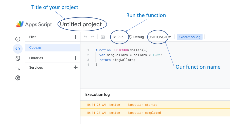We will be going through those 3 lines of codes to understand more about the USDTOSGD function. Before that, let’s get familiar with the Google Apps Script Interface.