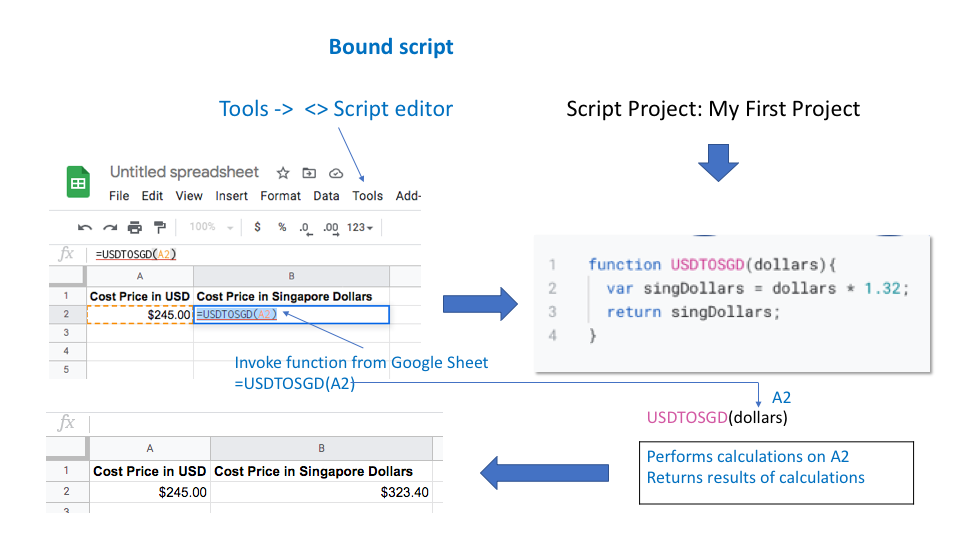 In this case, the function USDTOSGD can be called from the Google Sheet by simply typing